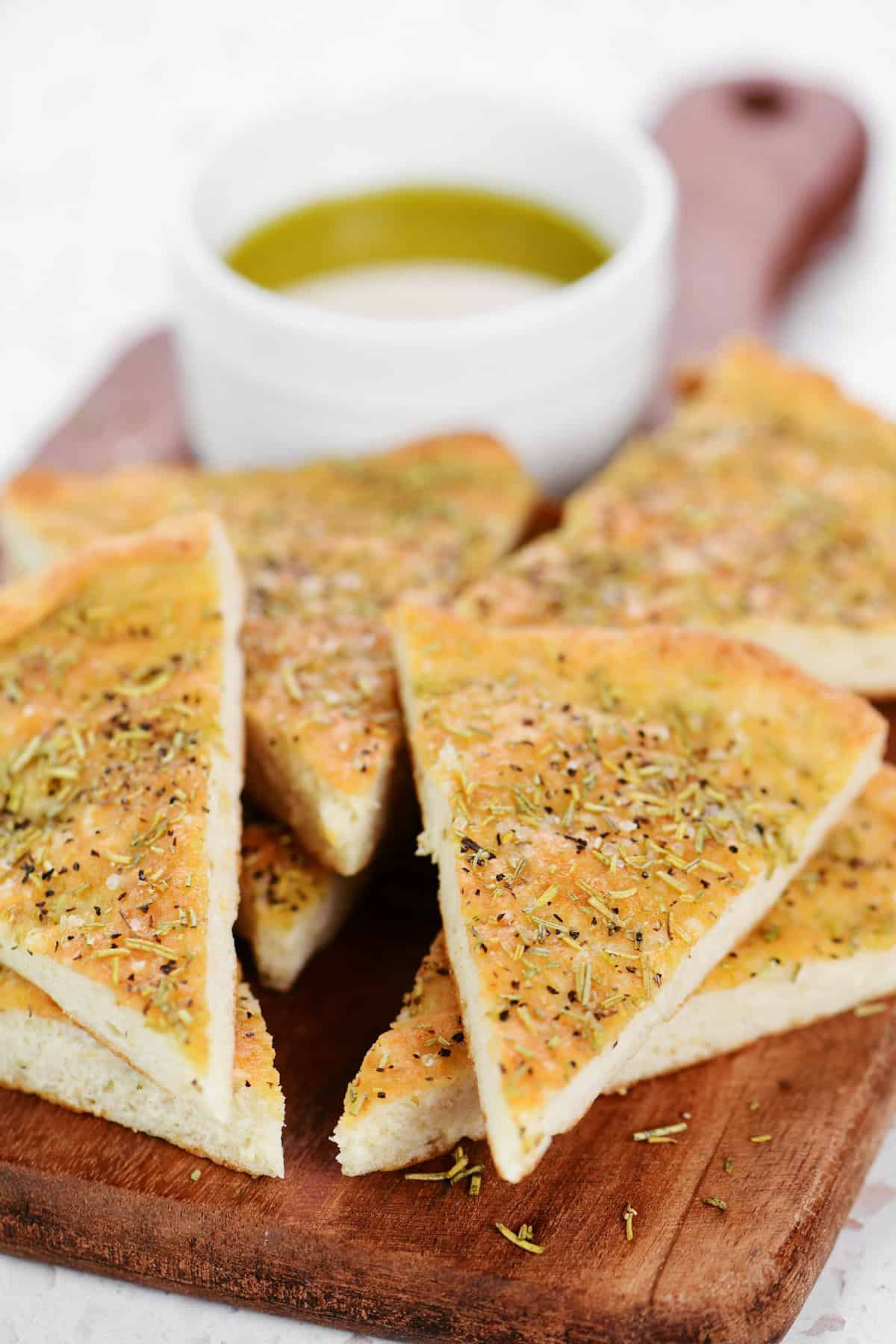 Finally, bake the cottage cheese focaccia at 400˚F for 13-16 minutes. Cut into wedges and serve with olive oil for dipping.